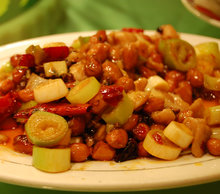 A spicy stir-fry dish made with chicken, peanuts, vegetables, chili peppers, and sichuan peppercorns.