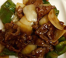 A dish consisting of sliced beef steak cooked with sliced green and/or red bell peppers, sliced onions, bean sprouts and other seasonings such as soy sauce and ginger.