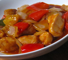 A sweet, slightly spicy, deep-fried chicken dish. For the sauce, combine vinegar, soya sauce, sugar, white wine, corn flour and stock. Fry the chillies, peppercorns with ginger, garlic and chilli powder.